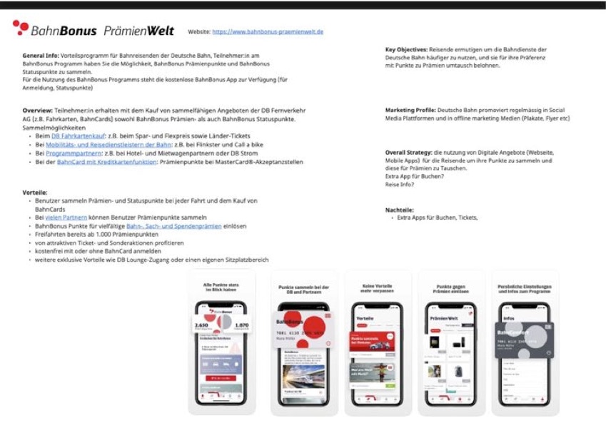 The analysis Iincluded mobility Apps like Jelbi, Fairtiq, Deutsche Bahn, Point. rewards programs, like PayBack, bahnBonusProgramm or Hytch rewards, and White Lable solutions with companies like Mobimeo or Hacon.